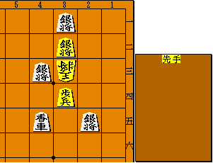 第43問 3四歩まで1手詰。 持ち駒に歩があったのでは、打ち歩詰めで詰まないが、この場合は、突き歩詰めで突くことができる。銀で王手するのは、その銀が動くために、するりと逃げられてしまう。 |