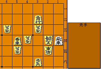 第158問 3三角・同玉・3四飛・同玉・4三馬まで5手詰。 6六角とこちらから打つのは5四金の移動合いで詰まない。3三角・同玉を決め、次の3四飛が妙手。単に4三とでは3四玉と上がられ4三馬は2二玉と下がられる。その二つの筋を3四飛の一発で実現させる(同金には4三と)。 |