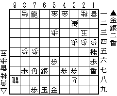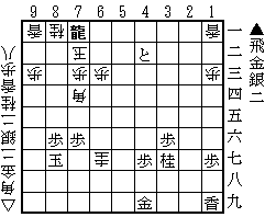 第646問 2一飛成・7二玉・7一龍(途中図)・同玉・6二金・8二玉・7一銀・8三玉・8二飛・9四玉・8五銀・9五玉・8四飛成まで13手詰。 飛車成りは当然として、次の龍切りから6二金の手筋が見えるかどうか。6二同玉には5二飛があるので逃げるが、後は持ち駒をどんどん打っていくだけ。 |