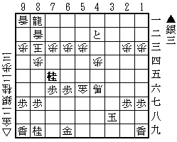 第777問 8四桂・同歩・8三銀・同玉・8一龍・8二香・7五桂(途中図)・9四玉・9五銀・8五玉・8六銀・7六玉・7七銀打・8七玉・7八銀まで15手詰。 6一銀ではと金がじゃまで詰まない。7五桂とこちらから打ち、9五銀から8六銀の節約で足りる。 |