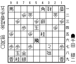 第235問 5三桂成・同銀・4一飛(途中図)・同玉・4三龍・4二金・5二銀(金)・3一玉・3二金・同金・4一龍まで11手詰。 5三銀では3一玉で駒が足りない。桂成りから4一飛が筋。二手目3一玉は3二銀から4二飛。この図のような二枚飛車の詰み筋は良く出てくるので覚えておきたい。 |