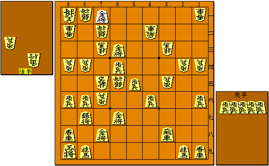 | (問36-1) 相振り模様の出だしから居飛車穴熊と向かい飛車穴熊に進んだ本局。じっくりした駒組みが飽和点に達し、先手の羽生四冠が仕掛けたが、これに後手が反撃、6、7筋に位を取った。今、▲6四歩と一本利かしの歩を打ったところ。6三と7二の金は外堀を守る要の駒だ。ここでは、どのように指すのが良いか。 (答えはこの下に) |