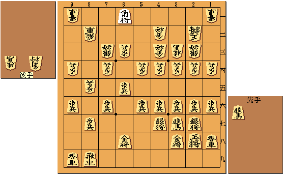 | (問473-1) 先手菅井五段、後手増田六段で戦型は先手中飛車からの角交換振り飛車。双方共に銀冠に組み、動きの難しい中盤戦の後、先手が動き少し局面はほぐれた。しかしまだその途中で、今▲6一角と打った所。この角、何もしない場合の狙いが一つあり、激しい動きには反撃しようと置いた角で当然だが簡単には捕まえられない。ここで後手増田六段の指した一手は何か?先手からの狙いを見破りその手を軽くいなす一手とは? (答えはこの下に) |