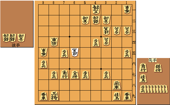 | (問474-2) 一時はそのまま寄ってしまうかとも思えた先手陣だが、強靱な粘りで決め手を与えないまま終盤戦になっている。今、△6五桂と角取りに当てて桂が跳んできたところ。角をどこへ逃げても△8七飛成が王手金取りになってしまう為角は逃げられない。そこで先手深浦九段の指した一手は?終盤戦特有の攻防手を放ちたいところ。 |