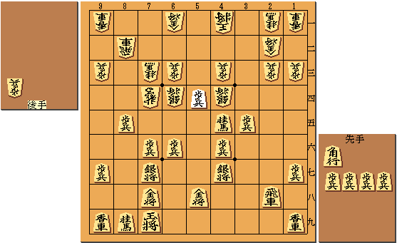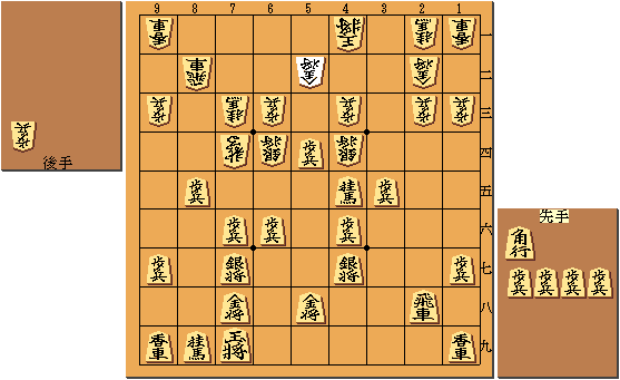 | (問484-1) 先手飯塚七段、後手屋敷九段で戦型は角換わり。但し、後手の屋敷九段が、カニカニ銀風に早めに銀を繰り出してきた為、手将棋模様となった。そして中盤、後手が馬を作りに行った手がそれほどの成果を上げず、逆に歩をたくさんもらった先手が反撃、やや指しやすそうな局面に。 下図は、その反撃を開始したばかりのところ。今▲5四歩と歩を垂らし、歩を成る手を見せながら、桂が入ると▲5三桂打も狙える。ここで後手屋敷九段の指した一手は何か? (答えはこの下に) |