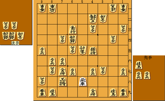 | (問789-2) 僅かな模様の良さから徐々に有利、そして先手の攻めを凌ぐと終盤では後手優勢となった。下図はその終盤。今△3七歩の叩きに▲5八飛と回ったところ。すでに優勢なので勝ち方としては一つではないかもしれない。ただ人間同士では特に棋力によっても勝ちやすい順と一手のミスで逆転する危ない勝ちの手と言うものもある。ここで指された後手の次の一手は?実戦の進行を三手まで。 |