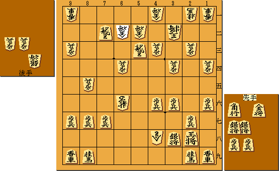 | (問808-2) 上図から数手後、先手に受けの誤算もあり後手の強襲が成功、逆転した。しかしその後、先手の飛車も今▲5三飛成と成り込み、優勢の後手としてはちょっとでも間違えると再逆転する怖い局面でもある。ここで後手の指した次の一手は何か?ここからの実戦の進行を三手まで。 |
